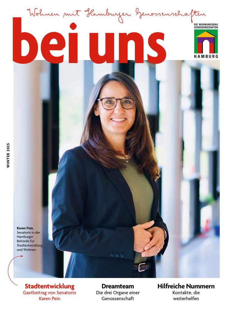 wir begrüßen Sie herzlich zur Winter-Ausgabe der „bei uns“. Was für Monate liegen hinter uns? Politologen sprechen angesichts der vielfältigen Herausforderungen von „Polykrise“. Umso wichtiger ist es, sich auch auf das zu besinnen, was sich stetig bewährt. Die UN hat 2025 zum „Internationalen Jahr der Genossenschaften“ erklärt – wir nehmen das zum Anlass, in der Titelgeschichte noch einmal die Grundprinzipien dieser guten Idee vorzustellen. Senatorin Karen Pein erläutert zudem in einem Gastbeitrag, welche besondere Bedeutung die Genossenschaften für die Stadtentwicklung in Hamburg haben. Und wir haben Service für Sie zusammengestellt: über die Online-Ausweisfunktion, über Lüften im Winter und klangvolle Events zum Jahresabschluss.